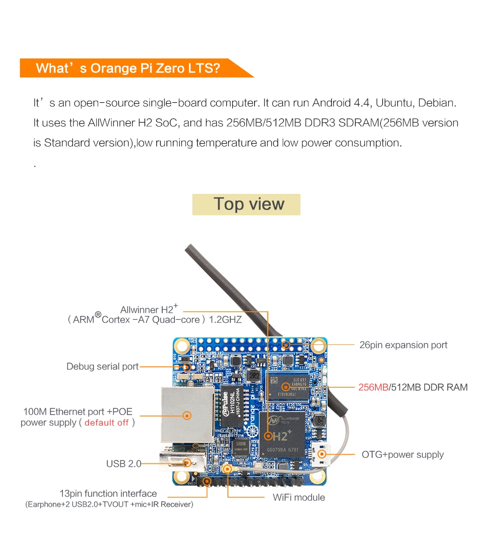It' s an open-source single-board computer. It can run Android 4.4, Ubuntu, Debian.. It uses the AllWinner H2 SoC, and has