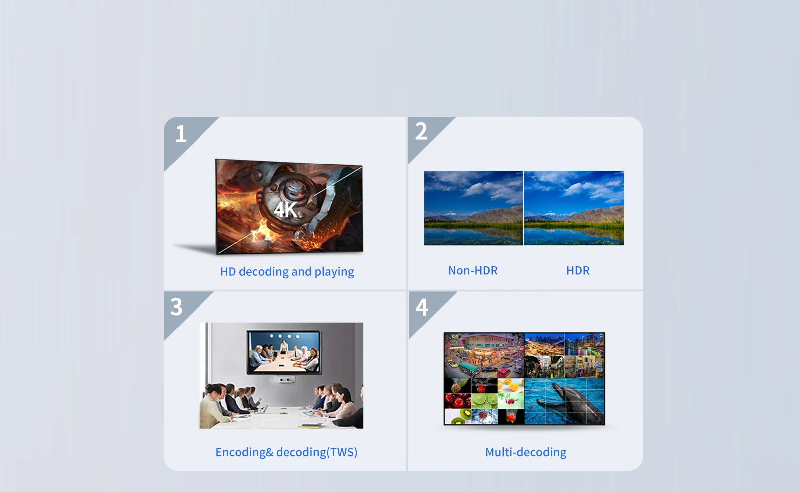 Support 4K resolution H.264/H.265/VP9 and other formats high-definition hard decoding, and can support multiple video sources decoding simultaneously, support HDR10 with excellent performance in color and dynamic range; FET3568-C SoM supports H.264 and H.265 format hardware encoding at 1080p60fps, and supports dynamic code rate, frame rate, and resolution adjustment.