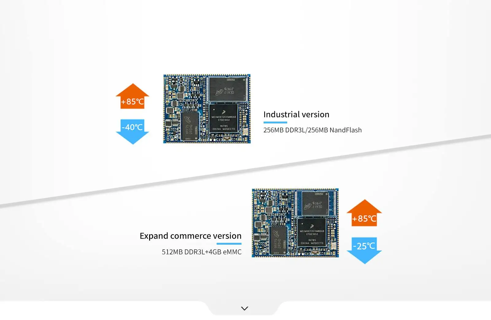 Both industrial grade and commerce grade are optional, 256MB DDR3L/512MB DDR3L RAM, 256MB NandFlash/4GB eMMC