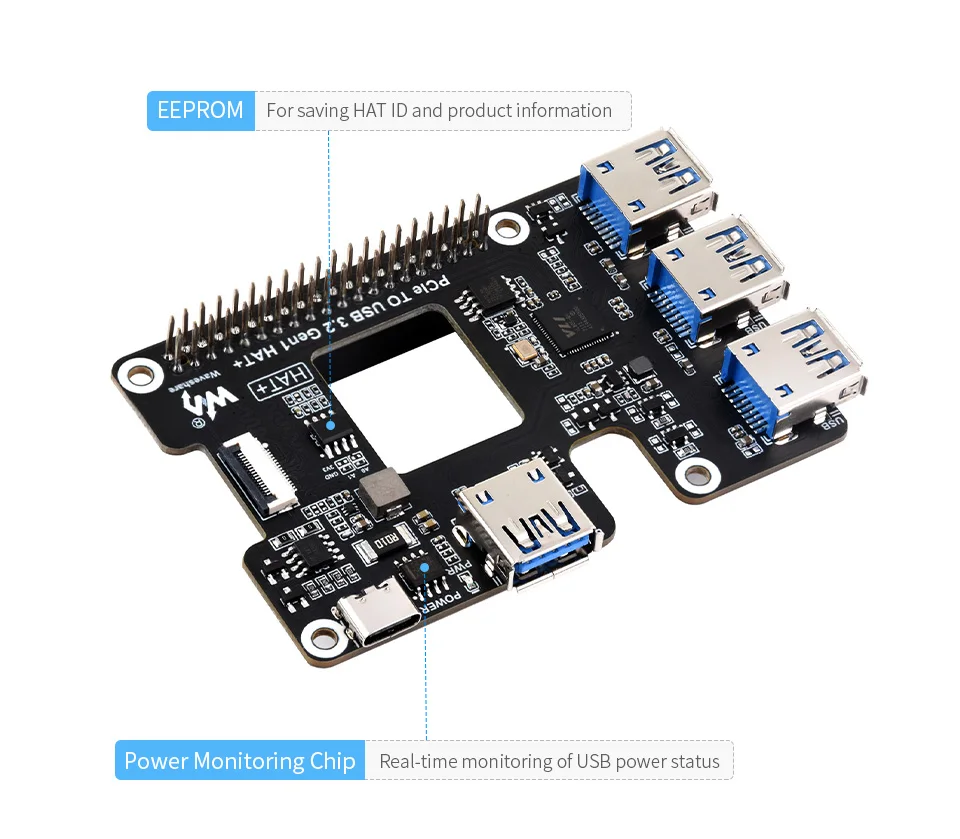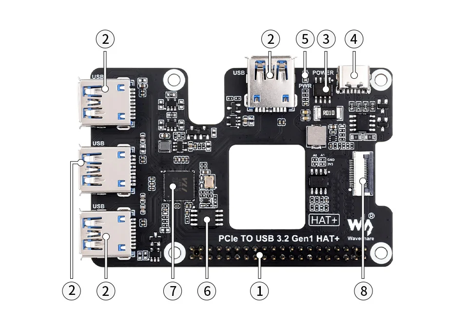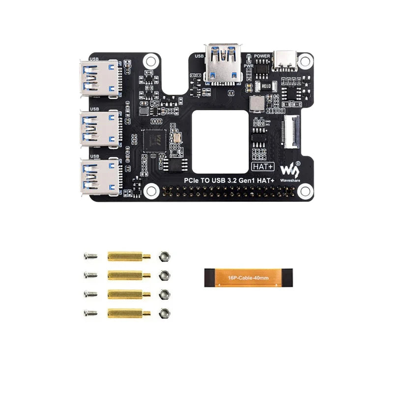 Custom PCIe To USB 3.2 Gen1 HAT for Pi 5 PCIe to USB HUB 4x High Speed USB Ports Plug and Play HAT+ for RPI 5