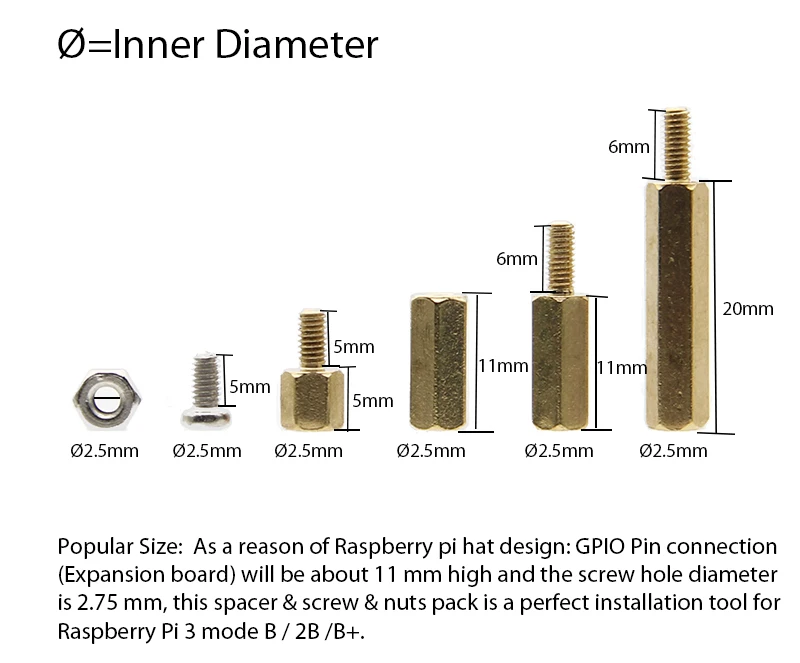 Popular Size: As a reason of Raspberry pi hat design: GPIO Pin connection (Expansion board) is about 11 mm high and the screw hole diameter is 2.75 mm, this spacer & screw & nuts pack is a perfect installation tool for Raspberry Pi 5/ Pi 4/ Pi 3 B+ / 3B / 2B /B+.