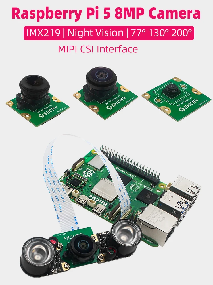 Raspberry Pi 5 8MP Camera IMX219 Sensor 77° 130° 200° FOV Fisheye MINI CSI Interface with 15cm FFC for RPI 5 Pi5