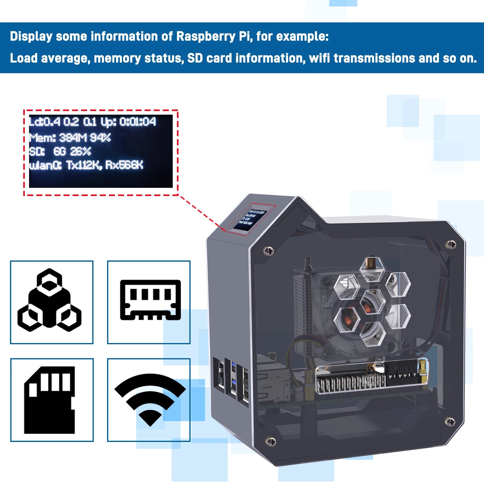 • 0.96 OLED Screen: Integrated with a small OLED screen for displaying system status information, such as temperature, CPU usage, and more.