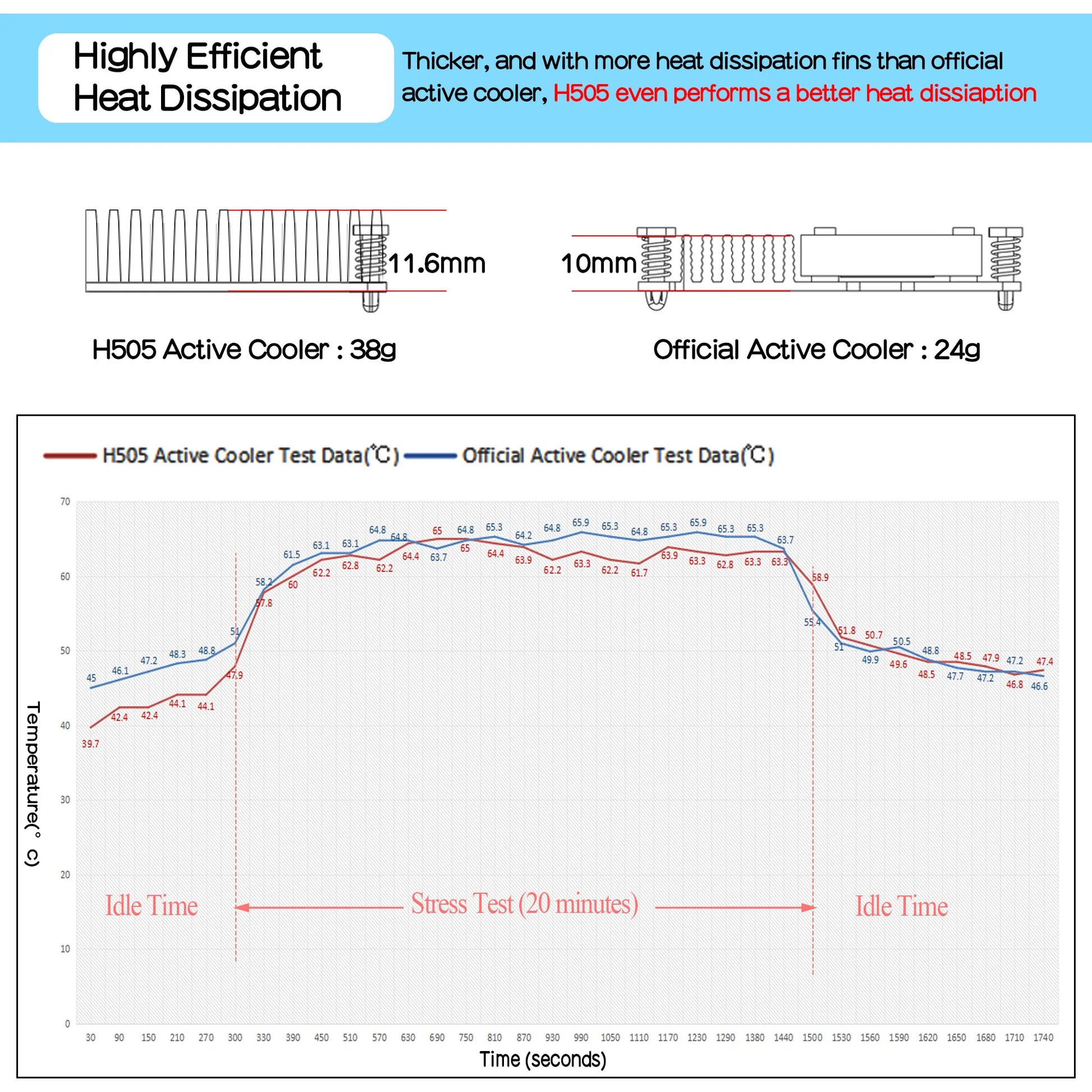 After testing, the heat dissipation performance of the Geekworm active radiator series is no less than or better than the official active cooler, and the heat dissipation performance of some models will exceed the official cooler, such as the H505 cooler, due to the use of thermal pads with higher thermal conductivity , while adding more thermal contact area in contact with the Raspberry Pi 5 motherboard, and the aluminum alloy heatsink is also thicker than the official cooler, and also has more heat dissipation fins. There is no doubt that its heat dissipation performance is more than Official cooler.