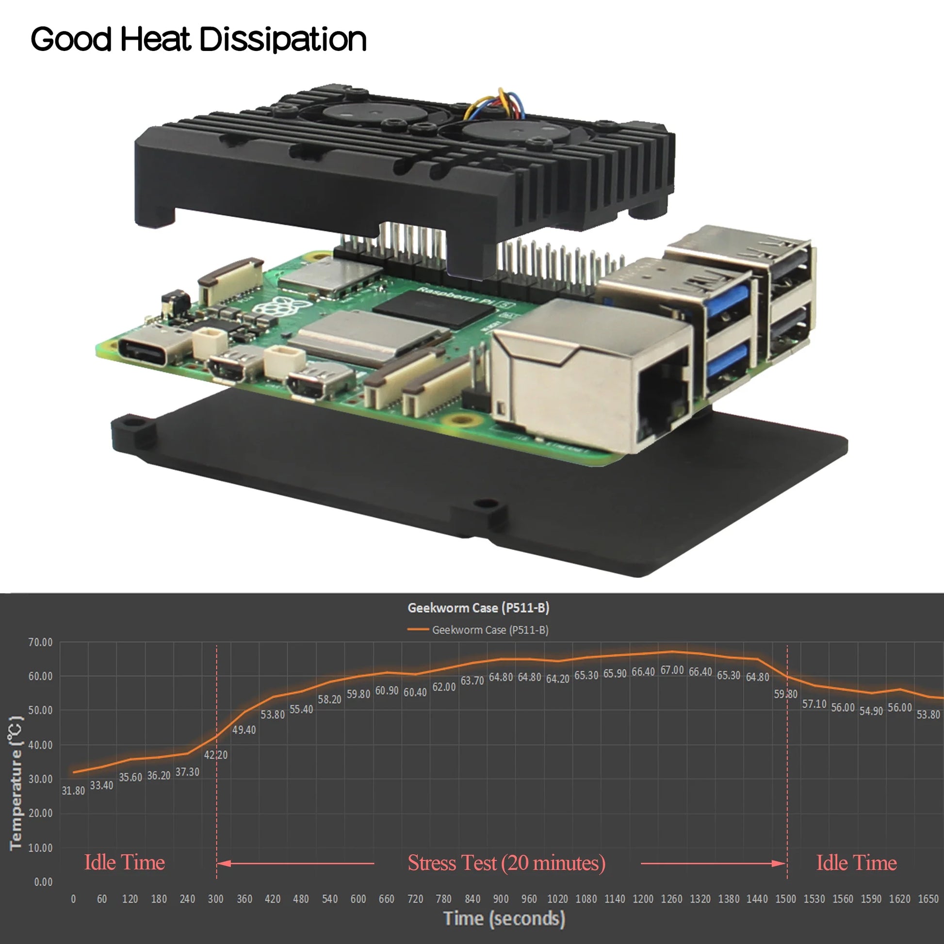 This is an aluminum Case with fan for Raspberry Pi 5 8GB / 4GB. It is available in a single-fan version (P511-A) and a dual-fan version (P511-B). Both cases designed with active cooling and passive cooling to provide fast heat dissipation for your Raspberry Pi 5.