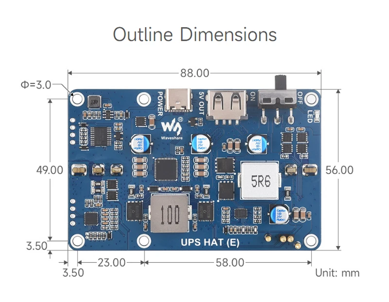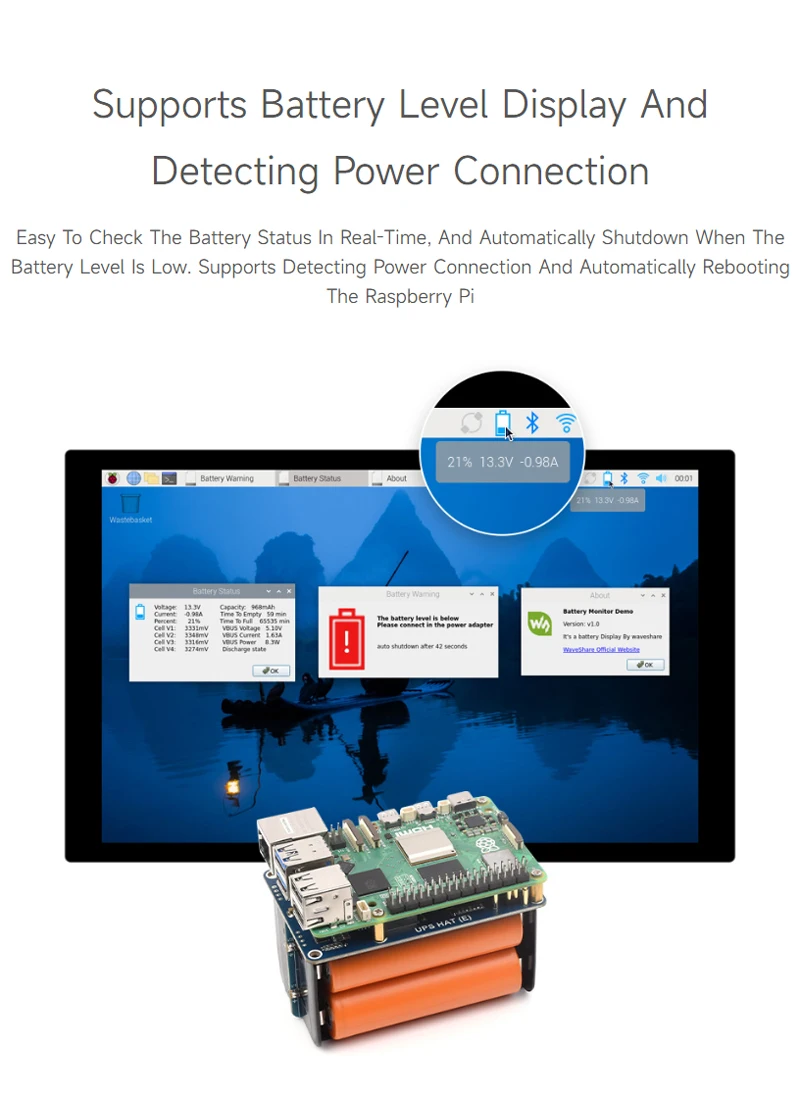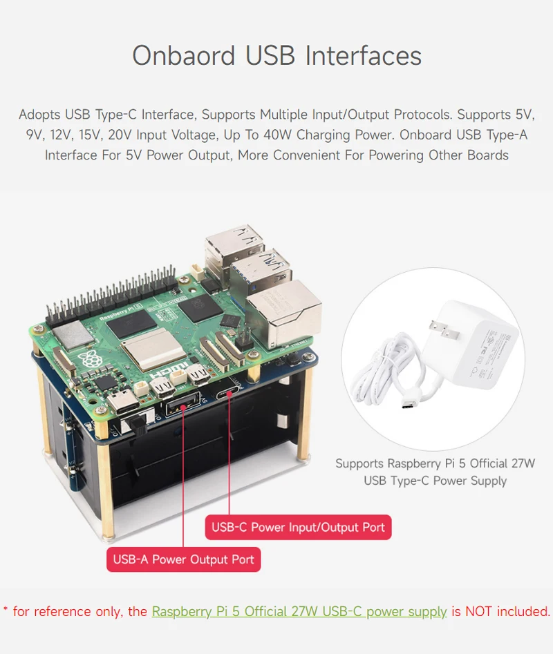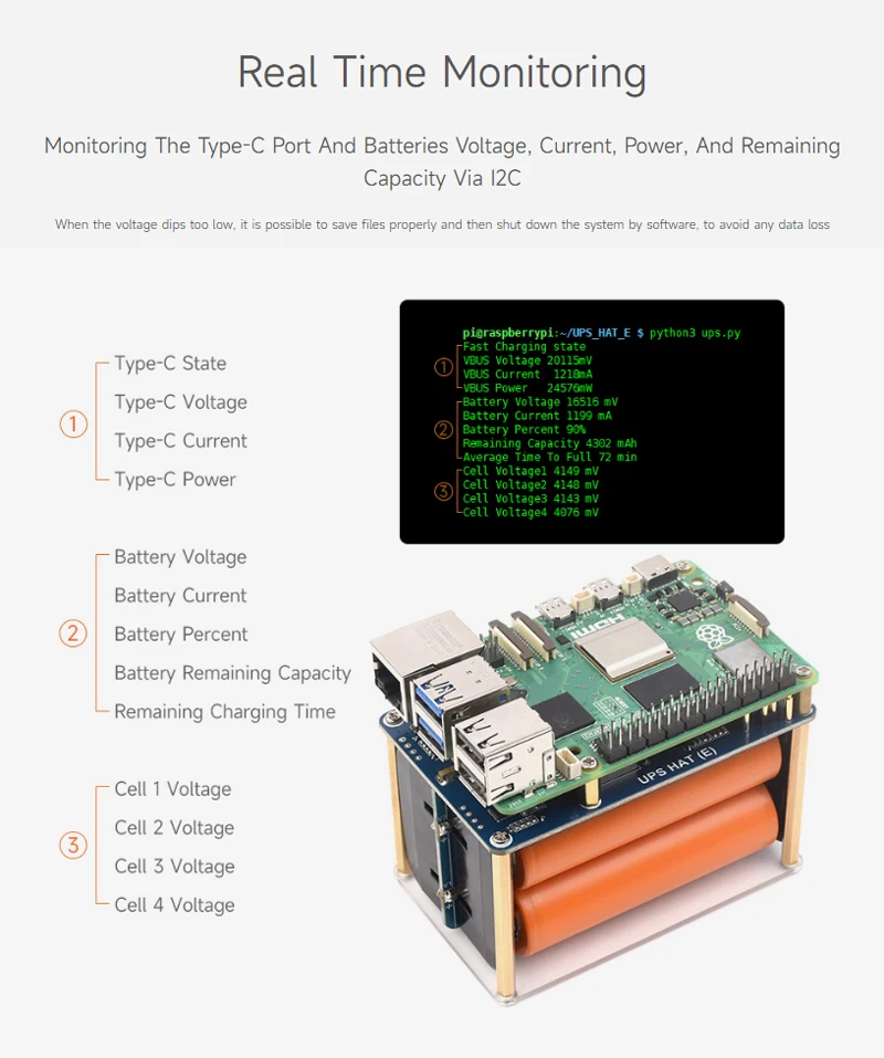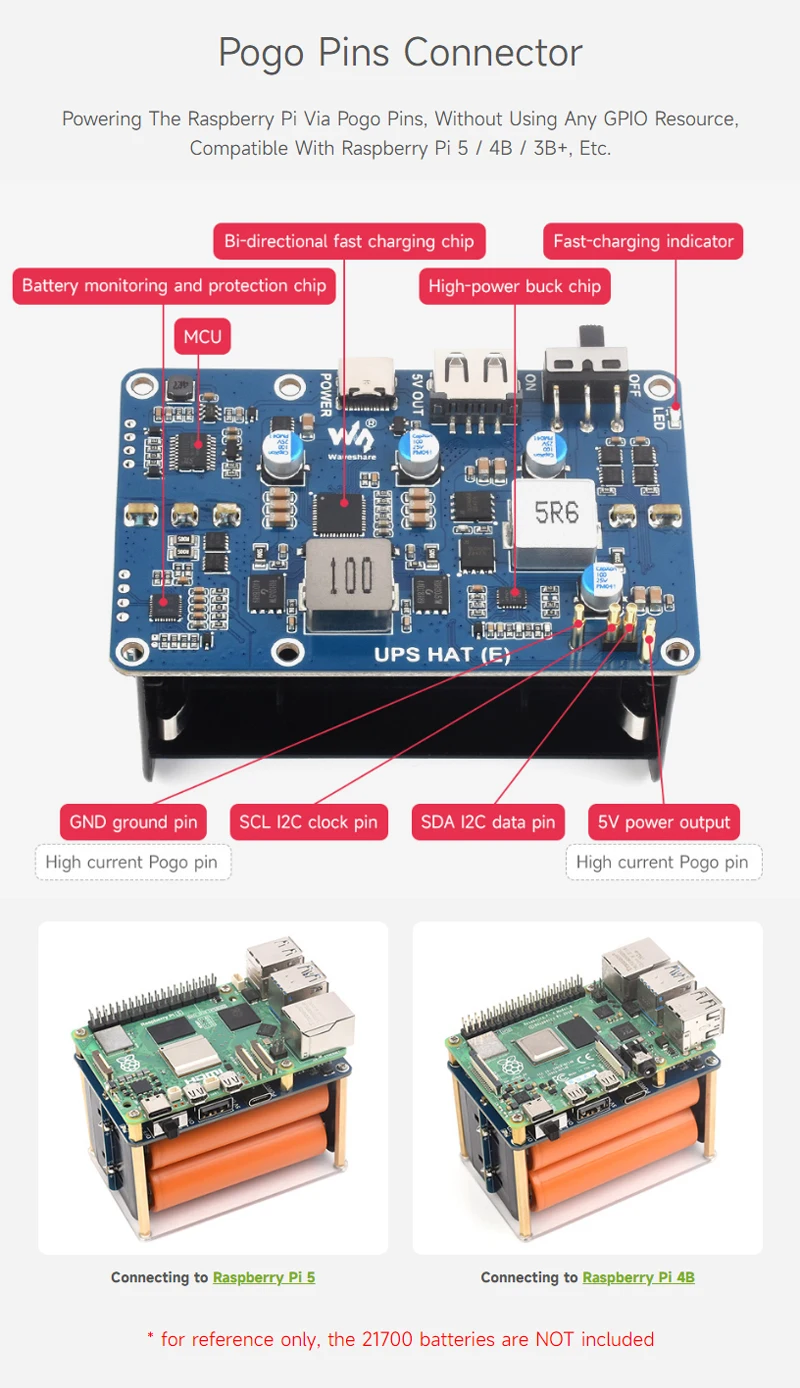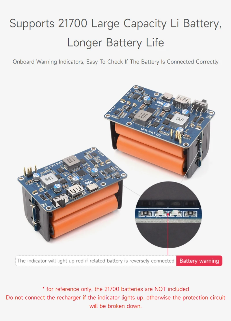 Raspberry Pi 5 UPS HAT (E) 5V 6A Uninterruptible Power Supply Supports 4x21700 Li Batteries (Not Included) Pogo Pins Connector