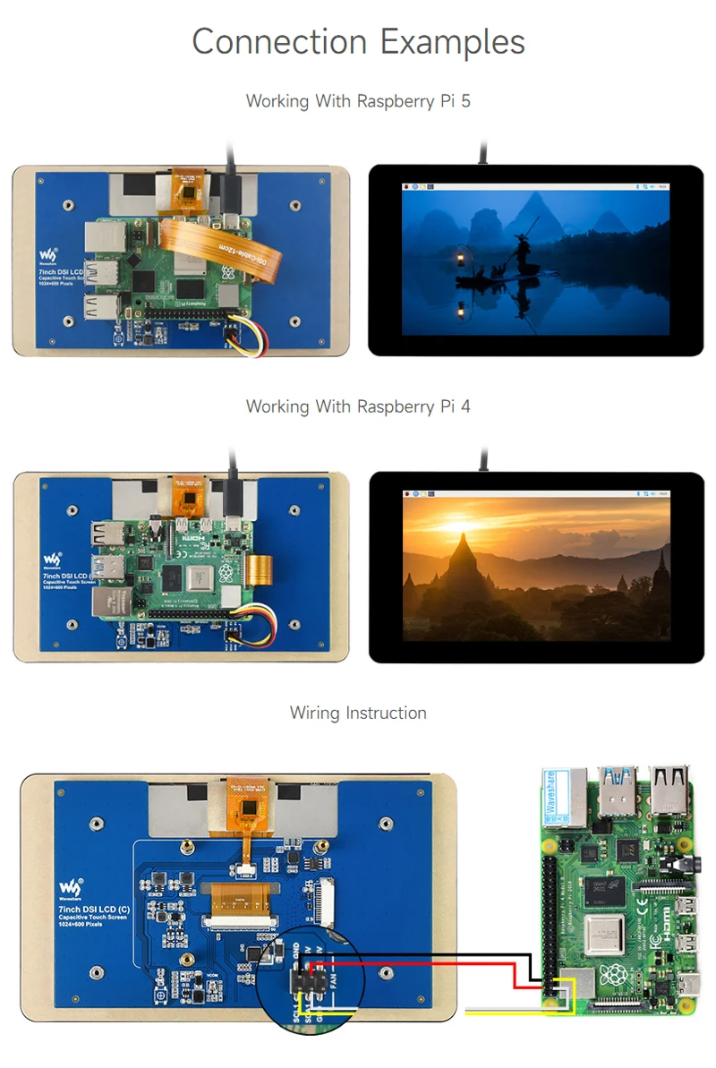 Custom Pi 7 Inch IPS Display 1024x600 Capacitive Touch Screen 5 Points Adjustable Brightness LCD for Pi 5 4