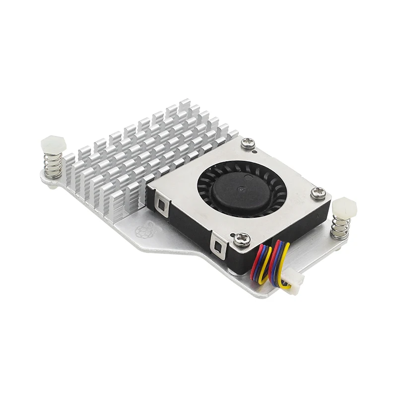 The Active Cooler combines a large metal heatsink with a high-quality variable-speed blower fan, powered and controlled via the fan connector on the Raspberry Pi 5, attached to the board via sprung pins into the dedicated pair of mounting holes.