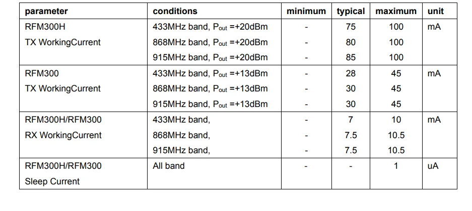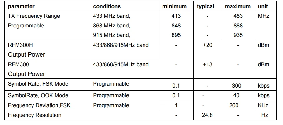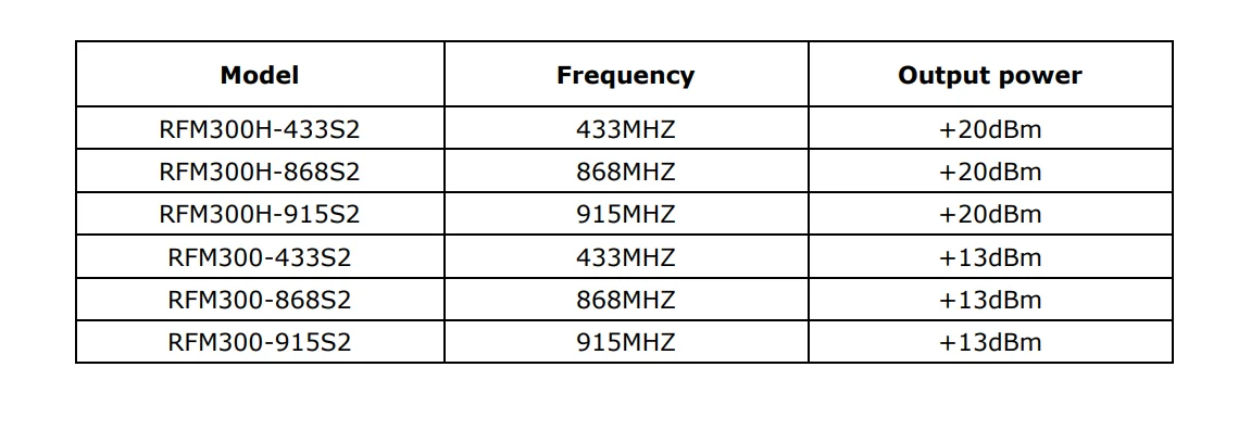 +20 dBm output power @RFM300H; +13 dBm output power @RFM300.