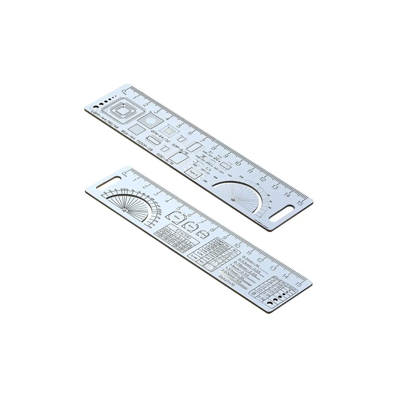 Our latest multi-function PCB ruler, in addition to measuring metric/INCH INCH MM size, line drawing, measuring Angle, and other basic functions, it also integrates the PCB used commonly used yuan patch standard encapsulation, line width size reference, borehole size reference, to be able to when you most need to query device packaging, to help you.