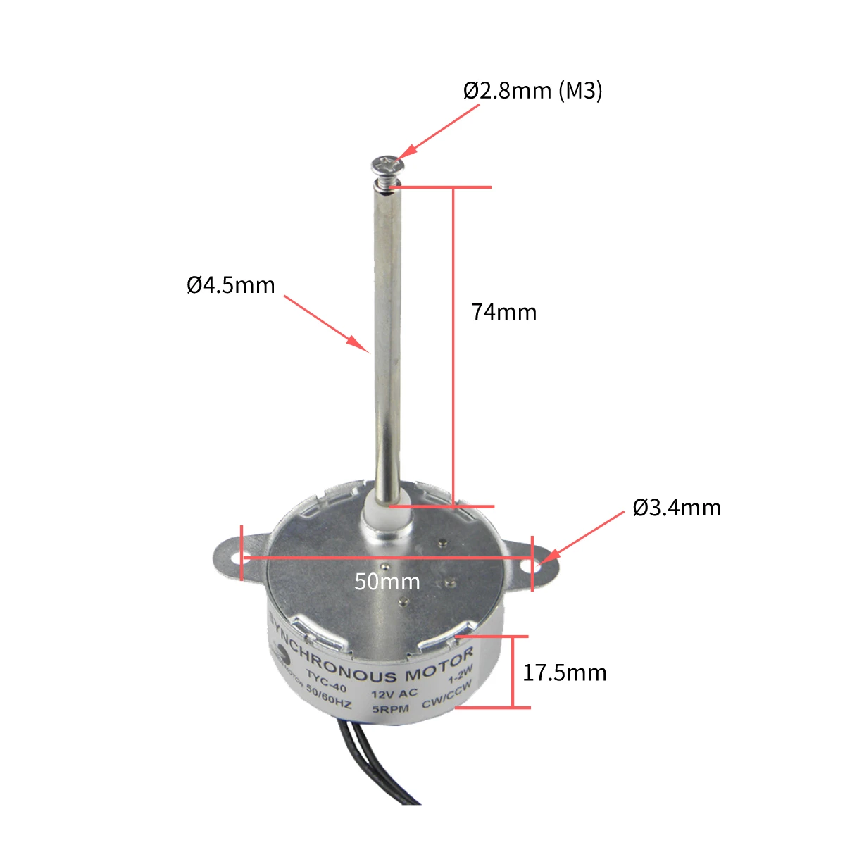 Product Name : Synchronous Motor; Model : TYC-40; Speed: 5RPM; Shaft Diameter: 4.5mm ; Shaft Length: 74mm; Shaft Screw Thread Inner Diameter: M3,(Φ2.8mm); Mounting Hole Diameter: M4 (φ3.4mm); Direction : CW/CCW(UNCONTROLLAB); Torque:≤0.5kg*cm; Frequency : 50/ 60Hz;