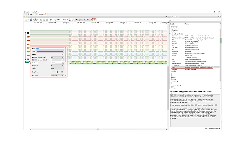 3.After signals are sampled, you can use decoder to decode them. Let's take UART sampled data as an example. Click the decoder menu and select UART protocol, then configure UART parameters such as channels, baud rate, data bits, parity type. Afterwards, the data sampled will be decoded.