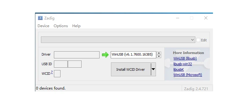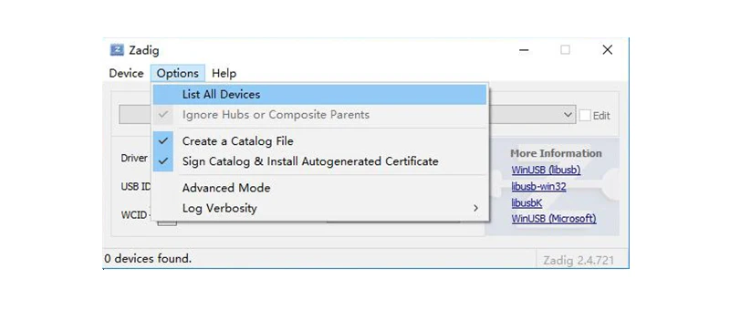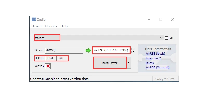 3.Click "Options" and toggle on "List All Devices". Choose device named "fx2lafw", whose USB ID is 1D50:608C and select "WinUSB" in the driver blanket. Then click "Install Driver" button.