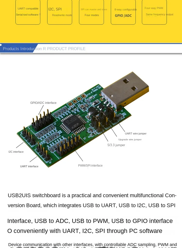 1>USB to UART, I2C, SPI (with 4 ADCs, 4 PWMs, 8 digital IOs)
