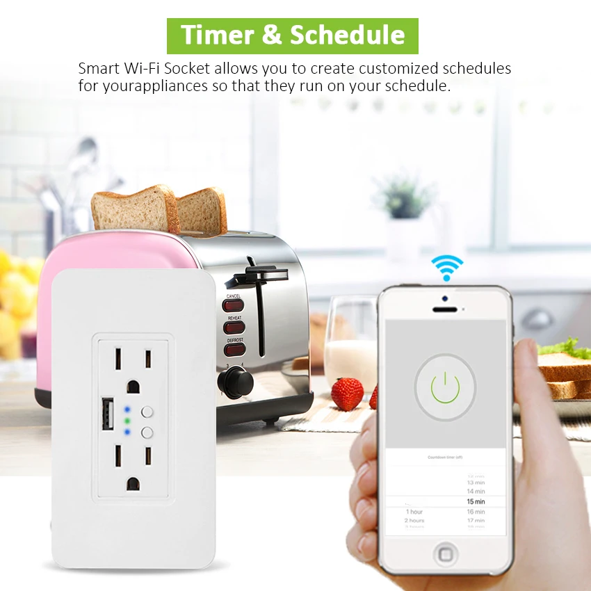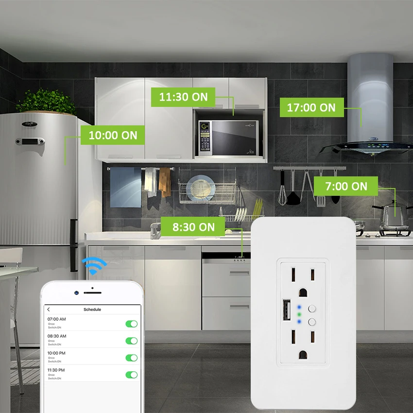 power off at the time you set via smart phone. 4.Schedules/ Counterdown: You can turn power on/off on your own timetable, or set a