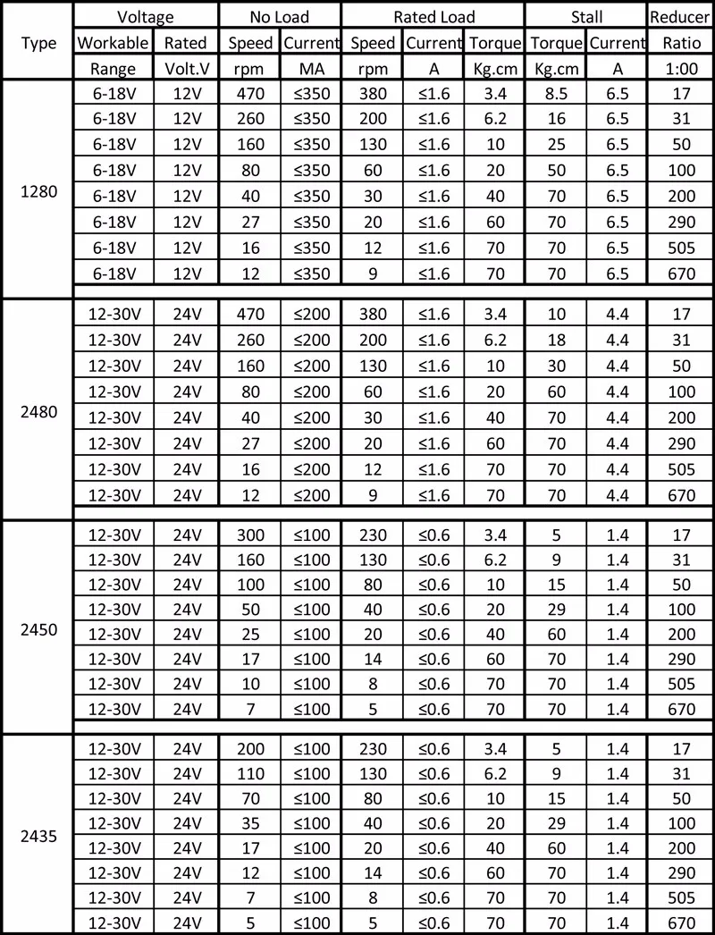Please see the Voltage Rated and No load speed in the following table. For example, you can choose 12v 40rpm, 12v 160rpm, 24v 470rpm etc.