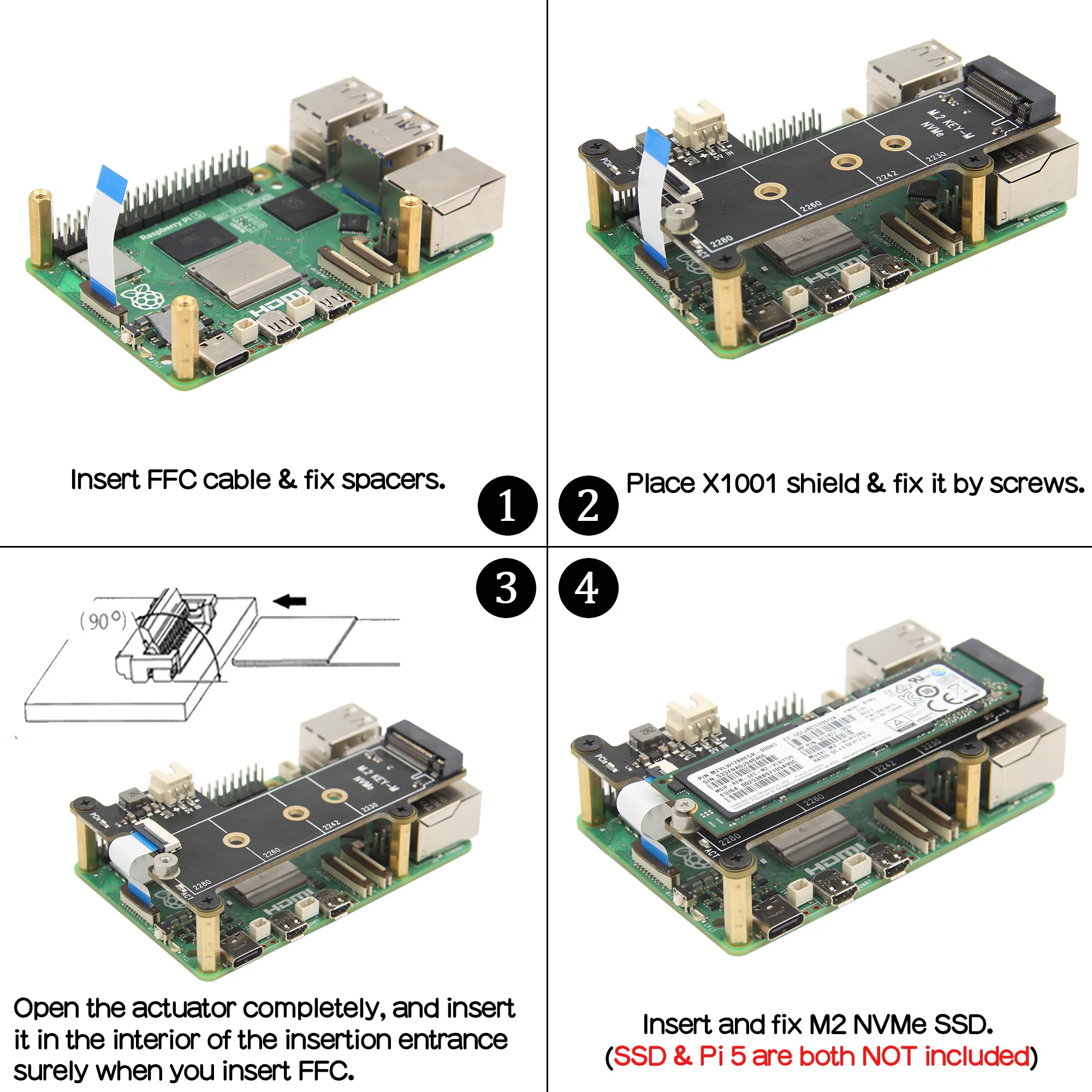 The X1001 V1.1 shield is an NVME M2 SSD PIP (PCIe Peripheral Board) for the Raspberry Pi 5 that uses the new PCIE interface of the Raspberry Pi 5 to utilise the NVME M2 SSDs for fast data transfers and ultra-fast booting.