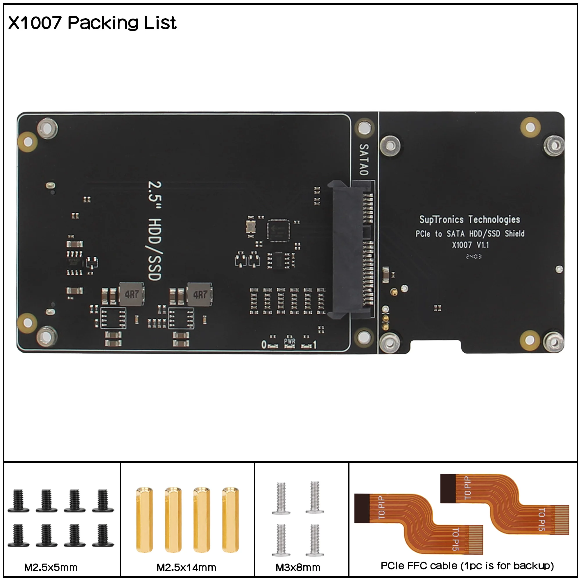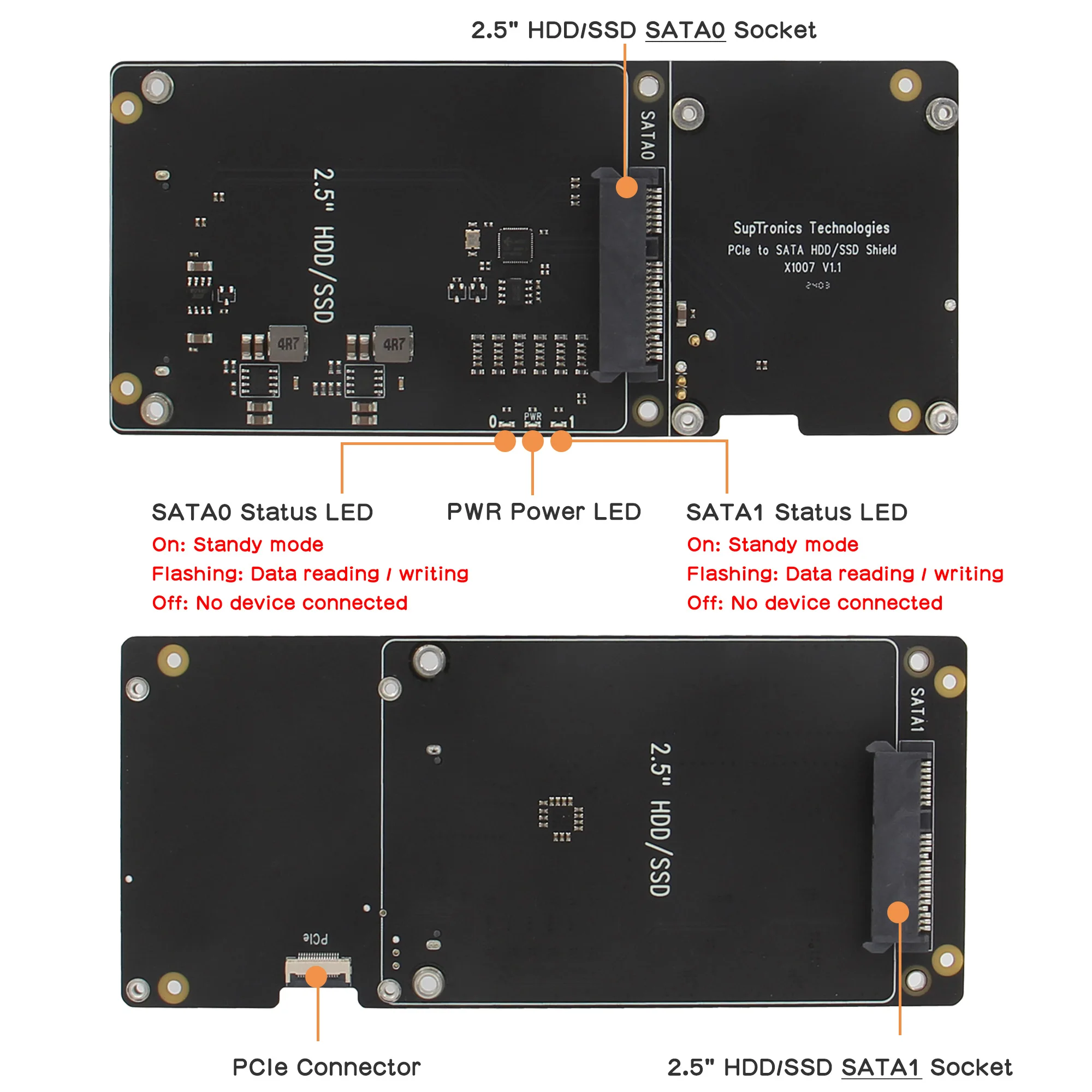 X1007 PCIe to 2 ports SATA HDD/SSD expansion board, designed to provide a mass-capacity storage and high-speed storage solution for your Raspberry Pi 5. This board facilitates the simultaneous connection of two 2.5-inch HDDs/SSDs, unleashing the full potential of your storage capabilities, with SATA 3.0 interface speeds reaching up to 5Gbps.