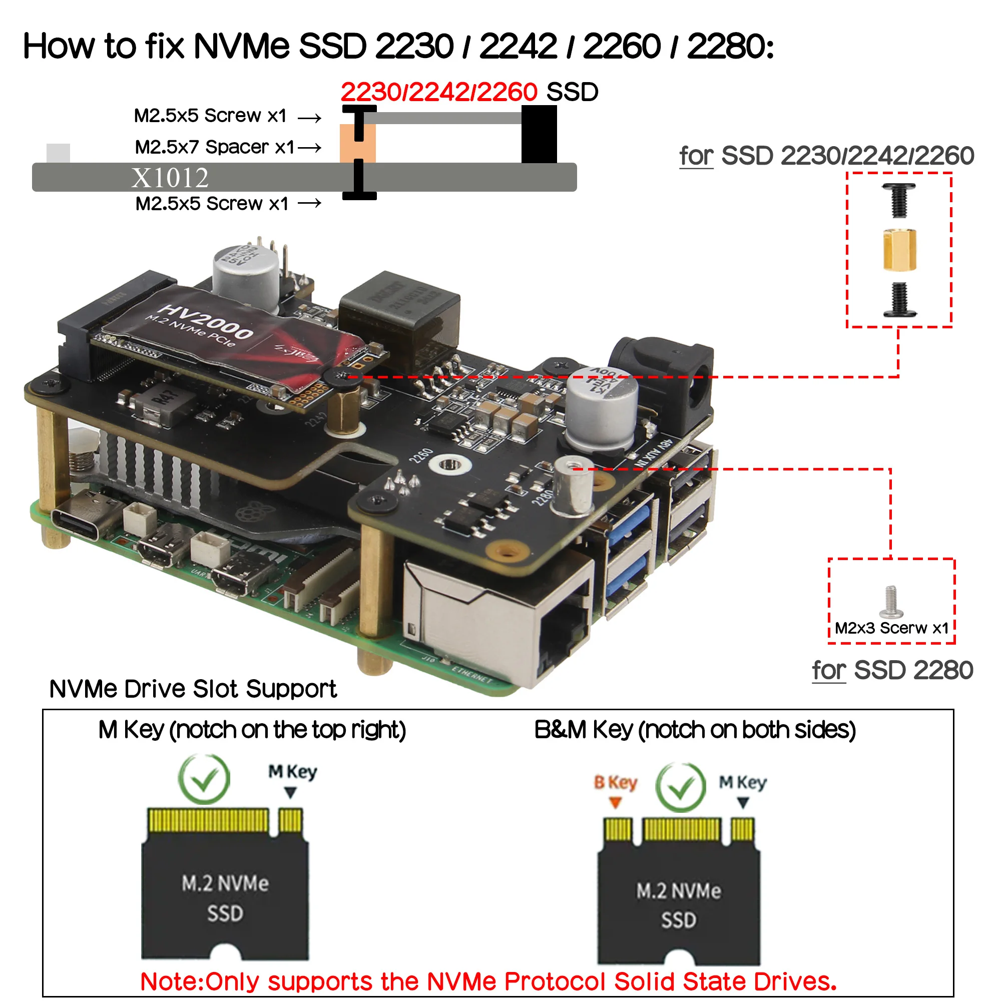 Geekworm PCIe to M.2 NVME Shield Sets: Model Compatible with Matching Case Matching Cooler Supported SSD lengths Raspberry Pi 5 2230/2242 Raspberry Pi 5 2230/2242/2260/2280 Raspberry Pi 5 2230/2242/2260/2280 Raspberry Pi 5 2230/2242 Model Compatible with Matching Case Matching Cooler Supported SSD lengths Raspberry Pi 5 Dual SSD:2280 Raspberry Pi 5 Dual SSD: 2230/2242/2260/2280 Raspberry Pi 5 2230/2242/2260/2280 Raspberry Pi 5 4 SSDs: 2230/2242/2260/2280