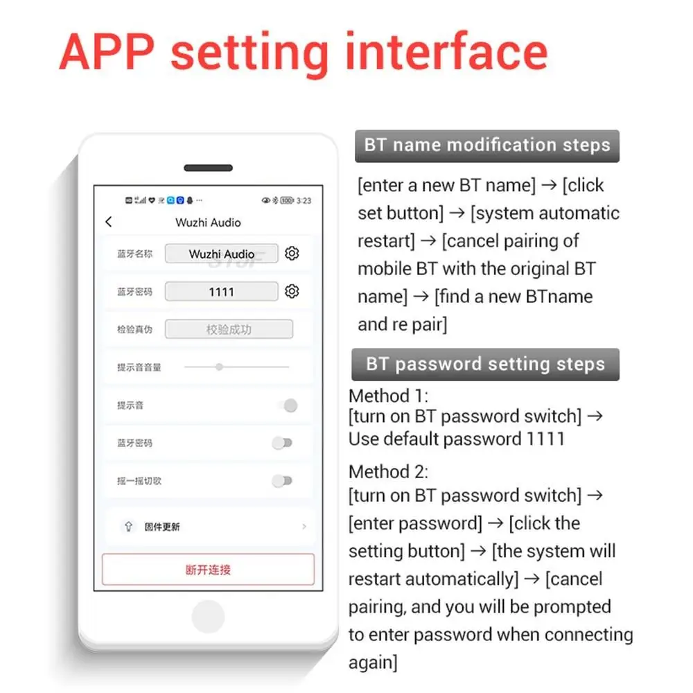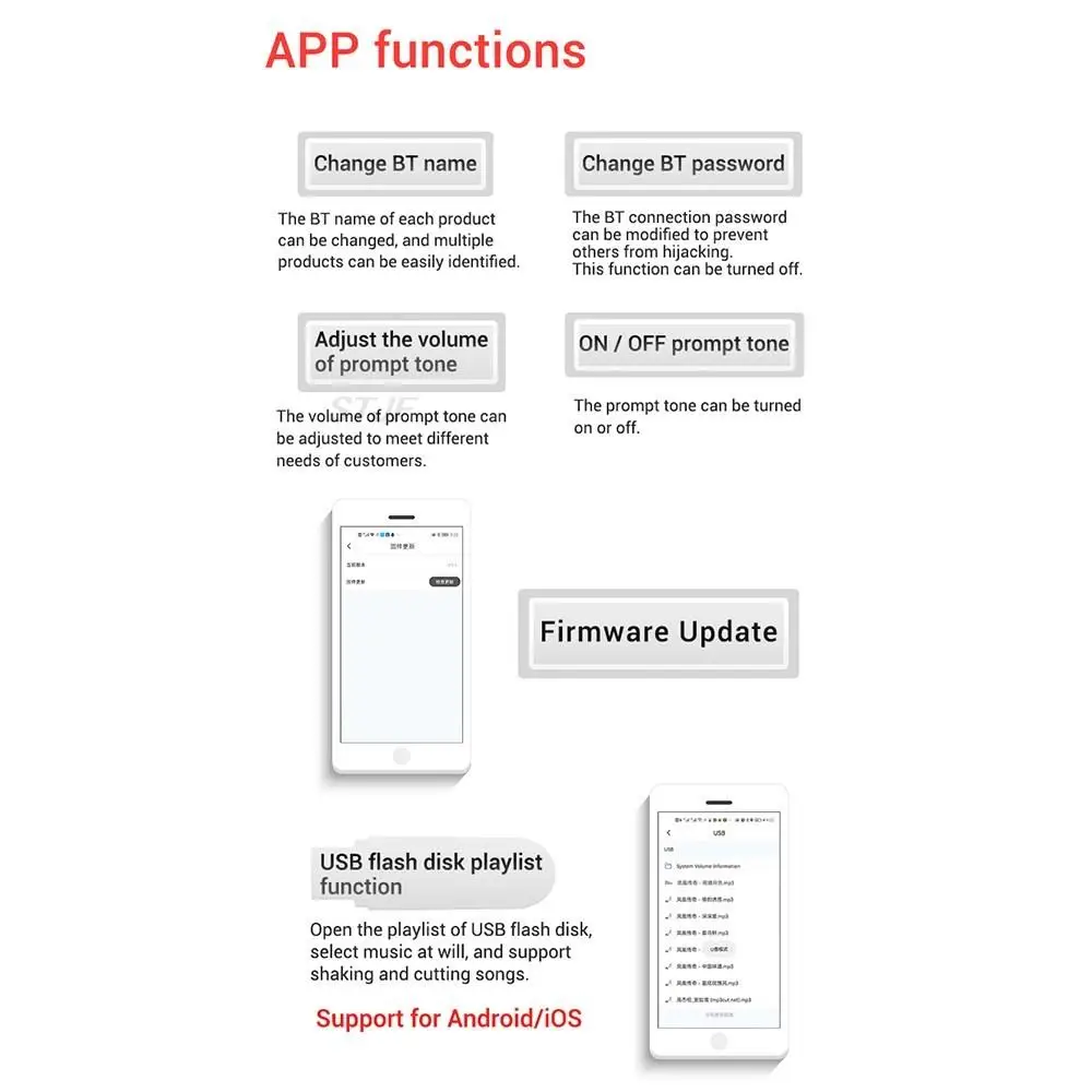 APP functions: changing Bluetooth name, setting password, setting prompt tone size, firmware upgrade, USB drive list, sleep music, etc