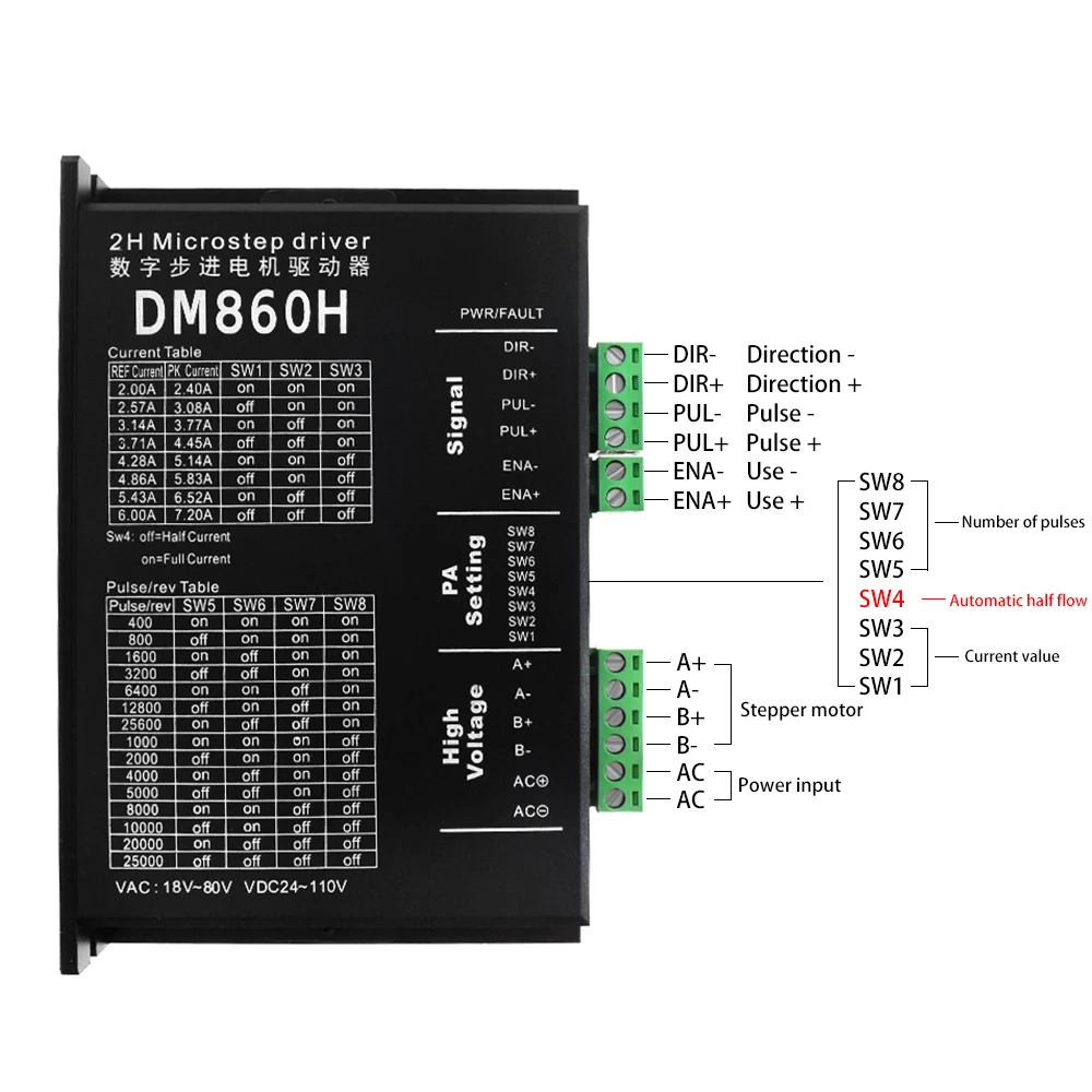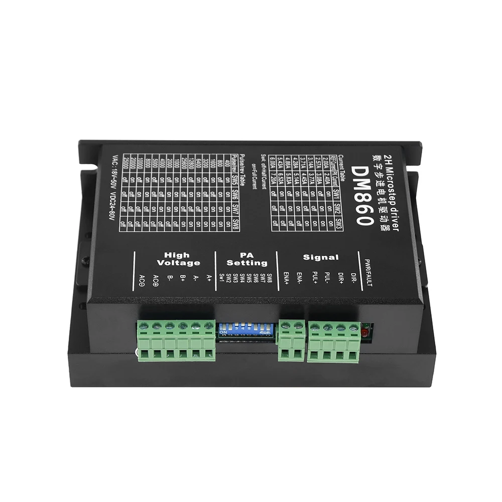 This driver is a DM860 digital DSP stepper motor driver, subdivision increased to 128 subdivision, suitable for high subdivision purposes. Suitable for stepper motors: Type 57, 86, 4 phase 2 phase (4 cables, 6 cables, 8 cables)