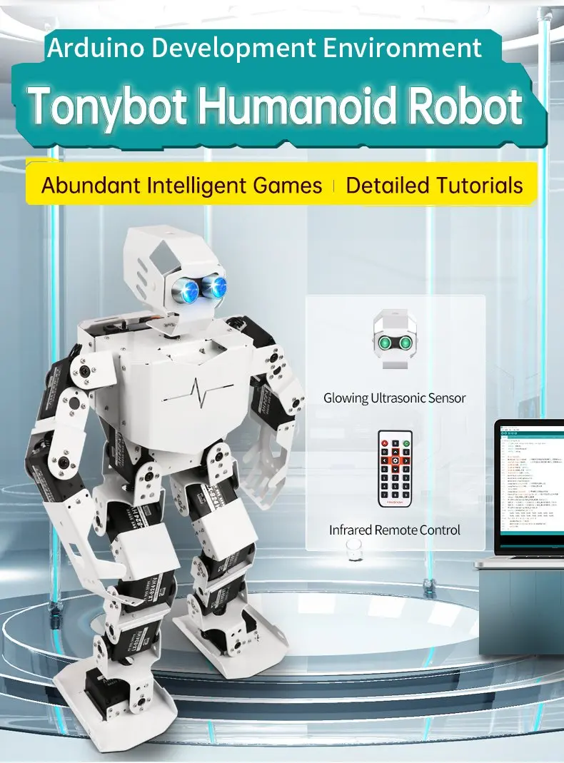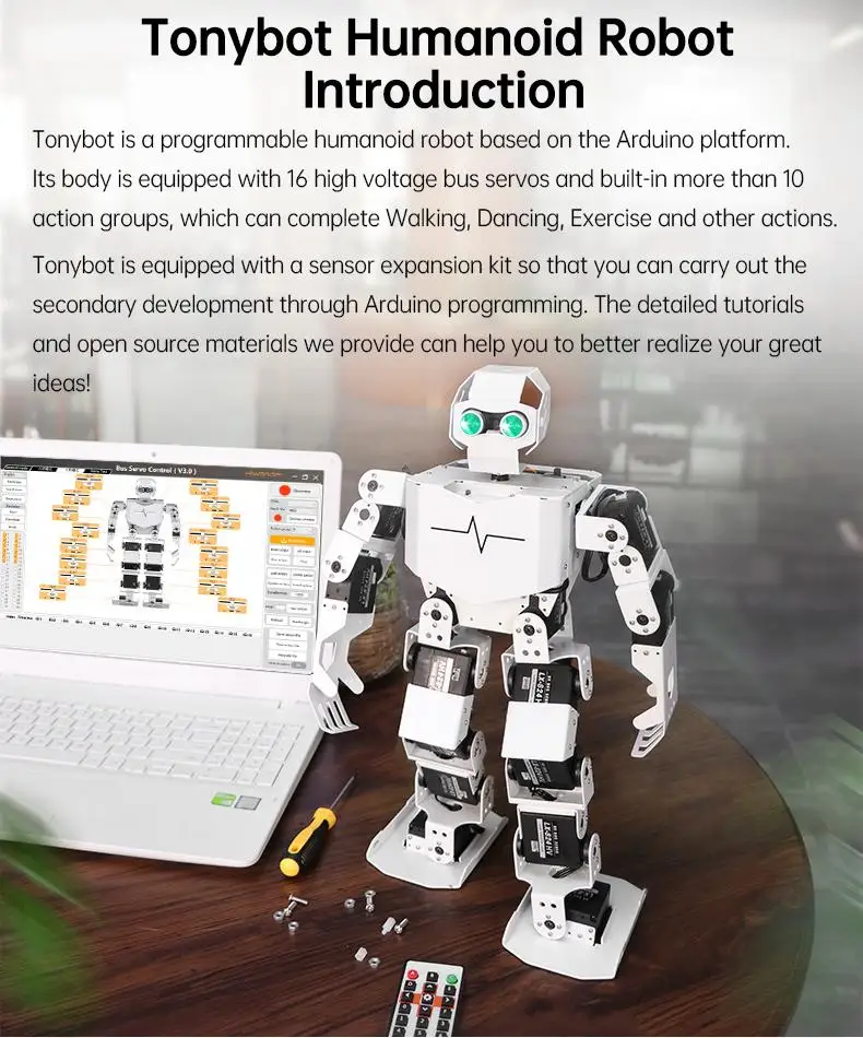 Tonybot is een programmeerbare humanoïde robot gebaseerd op de Arduino platform. Zijn lichaam is uitgerust met 16 hoogspanning bus servo en ingebouwde meer dan 10 action groepen, die kan compleet Lopen, Dansen, Oefening en andere acties.