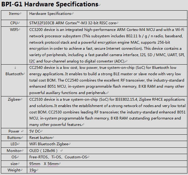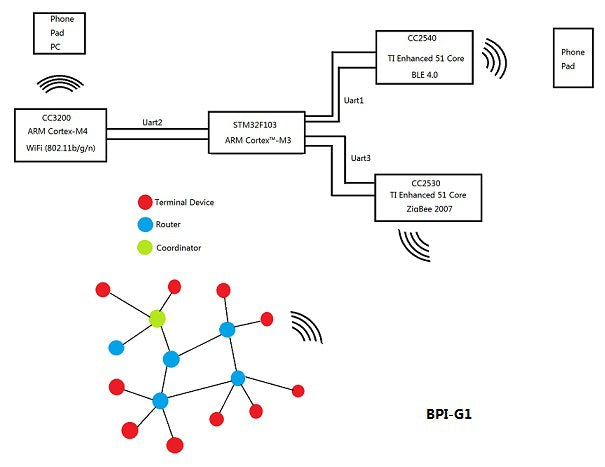 Meanwhile BPI G1 also incorporates a high-performance STM32 ARM® Cortex®-M3 microcontroller, which will help you deal with time-consuming data or transit, the three wireless SOC coordinated. Therefore, the use of BPI G1 can help you quickly achieve a variety of things DIY design.