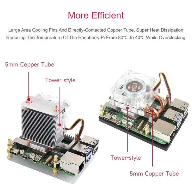 More Efficient: Large Area Cooling Fins And Directly-Contacted Copper Tube, Super Heat Dissipation, Reducing The Temperature Of The for Raspberry Pi From 80℃ To 40℃ While Overclocking.