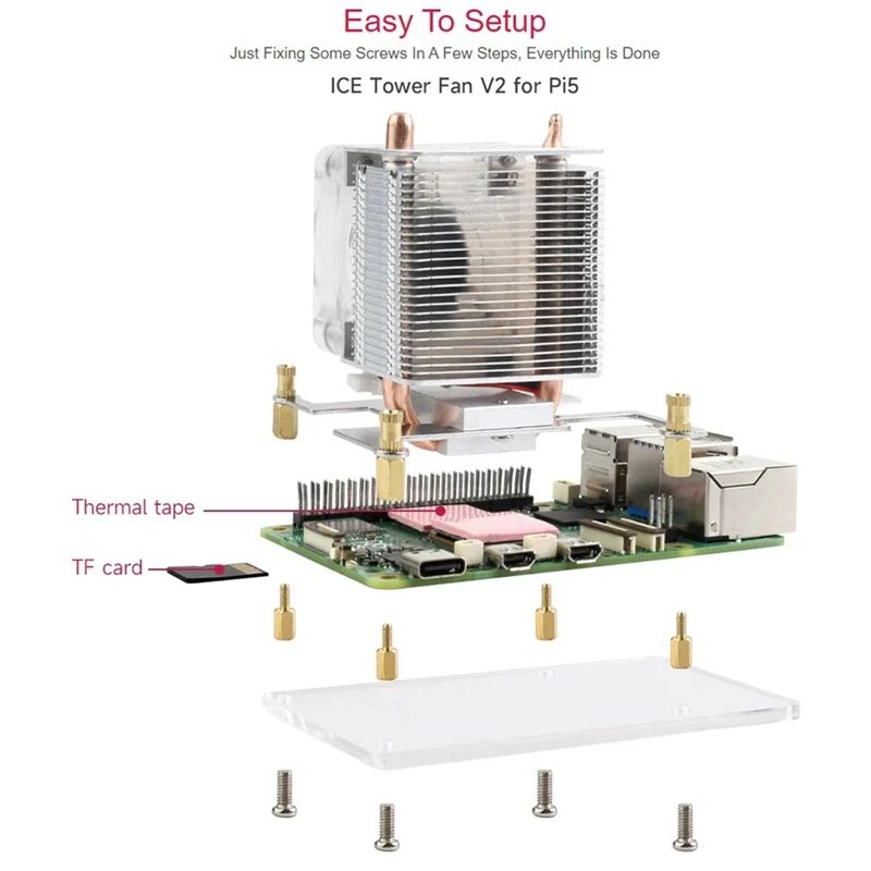 Low-Profile ICE Tower CPU Cooling Fan Suitable For Raspberry Pi 5. Tower-Style, 5mm Copper Tube, Multi Fins Heatsink, Powerful Cooling.