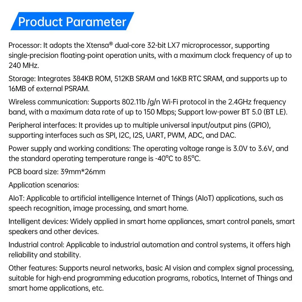 Features: 1. Equipped with ESP-S3 dual core processor, with a main frequency of 240MHz, supporting AI vision and speech processing. 2. Optional 0.96-inch OLED screen, supporting graphical display and interactive operation. 3. Built in microphone and speaker to achieve high-quality voice input and output functions. 4. Supports Wi Fi and Bluetooth 5.0, suitable for smart home and IoT applications. 5. The working temperature ranges from -40 ° C to 85 ° C, suitable for various environmental conditions.