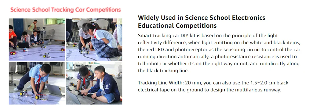* Input: Infrared photoelectric sensor * Output: Motor/LED * Power: 2*AA Battery(not included in the package) * Motor: DC motor (1:48 reduction) * Ranging solution: Infrared sensor * Line-tracking solution: Infrared sensor reflection * Dimension:110*110*47mm * Weight: 121g(without batteries) * Solding iron: we suggest that to use the low temperature soldering iron,and please use it with the guidance of parents or teachers.