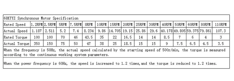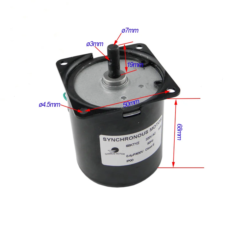 Voltage: AC 220V Frenquency: 50Hz~60Hz Current: 0.5A Power: 14W Speed: 1.2RPM Motor Dimension: 60mm*68mm Shaft Type: D-Type (Edge Milling: 0.5MM) Output Shaft Diameter: 7MM Output Shaft Length: 19mm