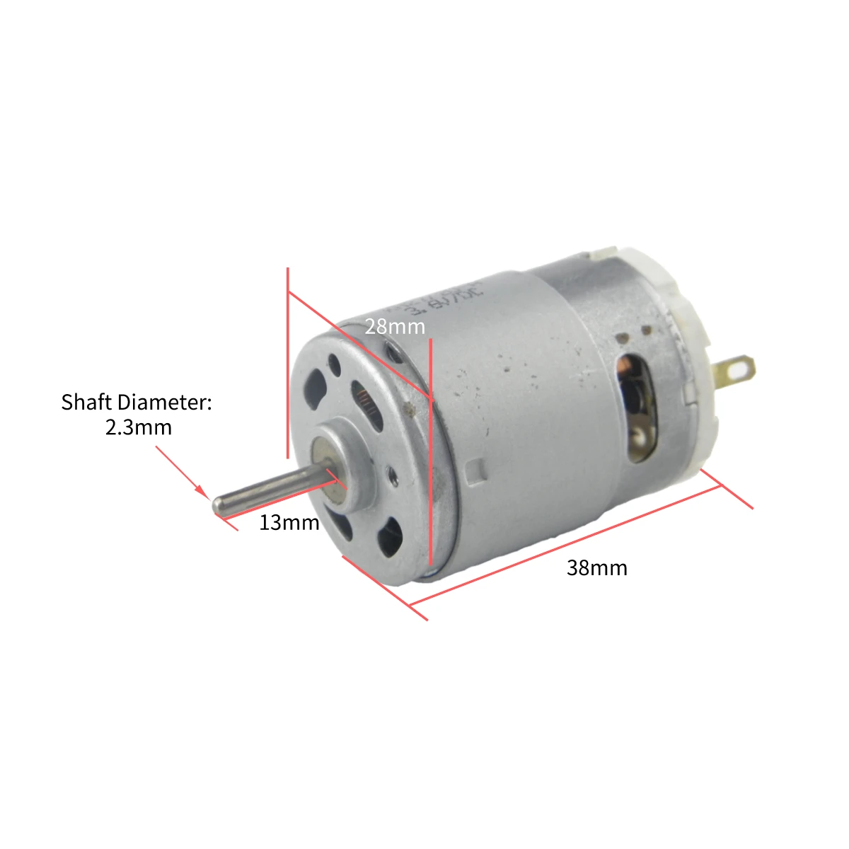 Rated voltage: 3.6V; 3V-3700RPM, No-load current: 0.95A, Blocking current: 1.35A. 6V-11500RPM, No-load current: 1.9A, Blocking current: 1.08A. Motor Body Diameter: 28mm/1.1inch; Motor Body Length: 38mm/1.49inch; Shaft Size: 13 x 2.3mm/0.51in x 0.09in (L*D)