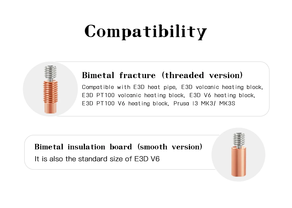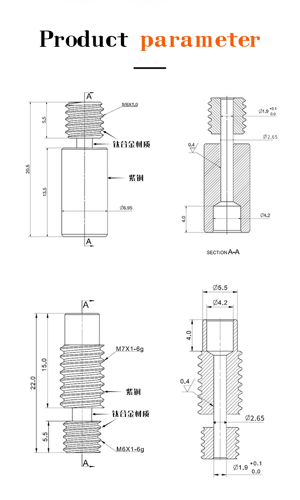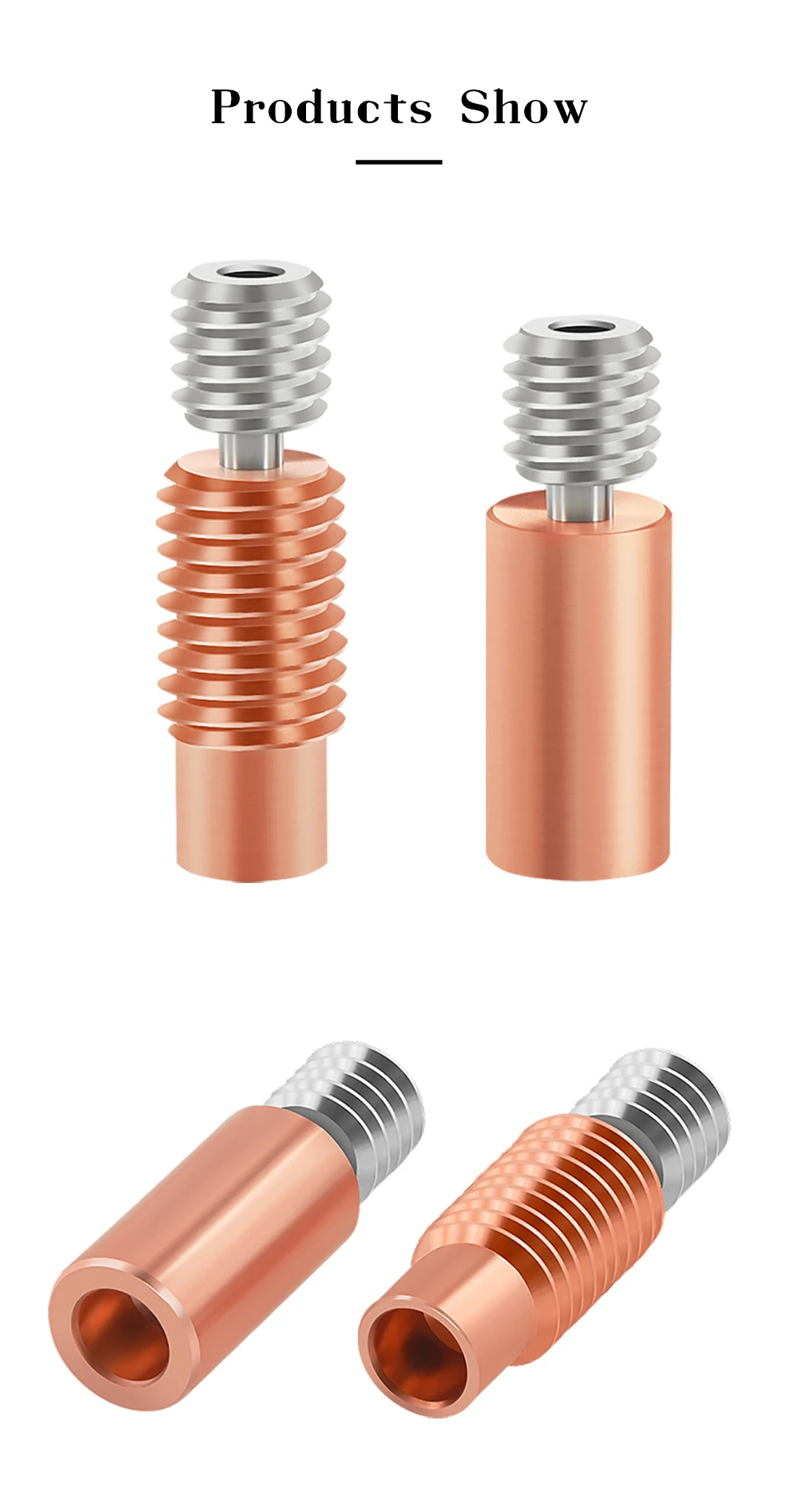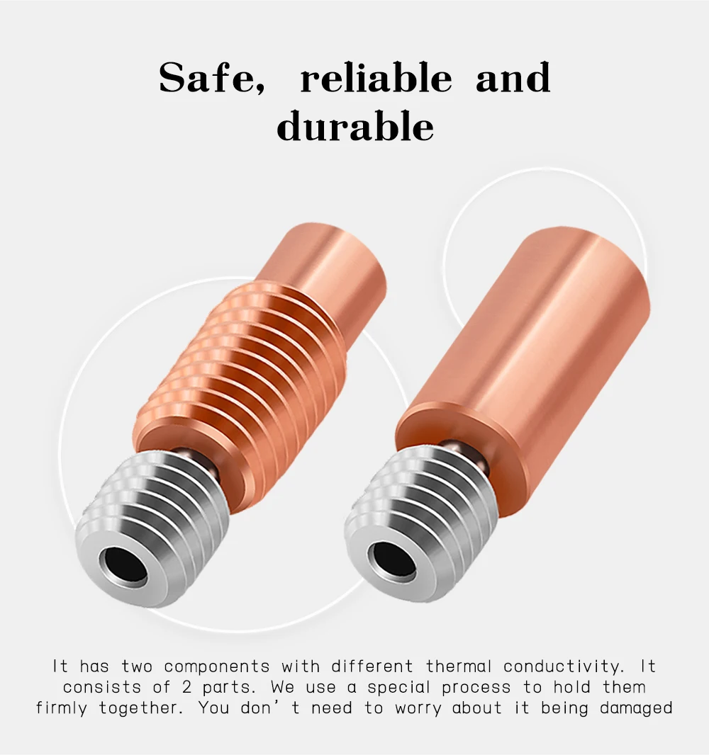 This is a branch design of the bimetal HEATBREAK. Its thermal blocking front end is made of titanium alloy and the back end is made of copper alloy material. It has a strong thermal blocking ability. We recommend you to use it.
